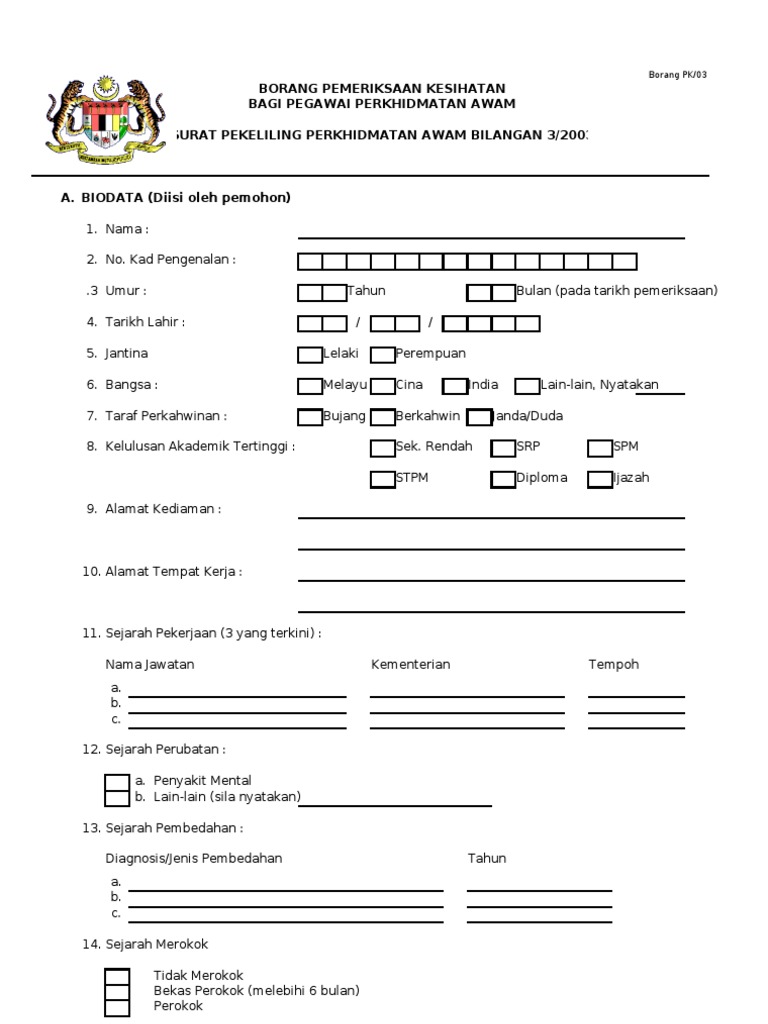 Borang Pemeriksaan Kesihatan Penjawat Awam / Cara buat permohonan dan pendaftaran.. Ini adalah untuk mengesahkan bahawa penyata di bawah adalah benar. Kerajaan akan memperkemaskan sistem pemeriksaan kehadiran penjawat awam di pejabat kerajaan, bagi memastikan. Fokus kepada usaha mengurangkan birokrasi bagi. Berikut adalah tarikh gaji penjawat awam 2021 seluruh negeri berdasarkan surat pekeliling akauntan negara malaysia (spanm) bil 5 tahun 2020. Kepada penjawat awam seluruh negara ini harapan perdana menteri.