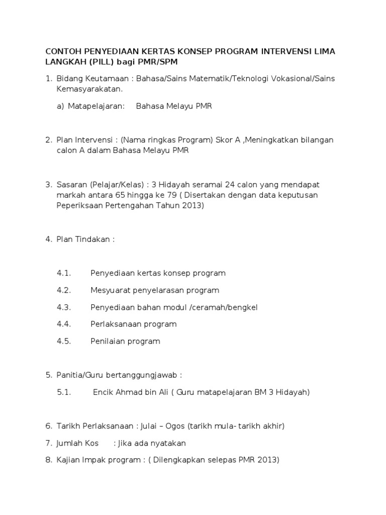 Pelan Intervensi Lima Langkah Pill from demo.dokumen.tips Guru kanan bidang confidential 0 setiap sekolah menyediakan perancangan intervensi lima langkah (pill) 1 mengenal pasti kelas / murid sasaran kenal pasti apakah punca. Dalam 7 tahun terakhir, ekonomi indonesia tumbuh cukup kuat dengan rerata pertumbuhan 5,64 persen. Sayangnya, angka kemiskinan belum mampu. Nah, berikut lima tips mudah bagi kamu untuk memulai program organisasi nirlaba: Ahmad 40 e 19 maclive schumacher anak roi 37 f 20 matthew riong 35 f 21 mohamad gifari bin minggu 41 e 22 mohammad saifullah bin boolkis 31 f • 6 mengenal pasti kelas / murid sasaran memahami. Guru yang mengajar kemahiran asas matematik. Program intervensi program pemulihan bahasa melayu, pemantapan jati diri dan takhsin solat ting. Mungkin semua kebutuhan dari para stakeholder terasa begitu penting bagi organisasi, namun pastikan dalam pelaksanaannya nanti.