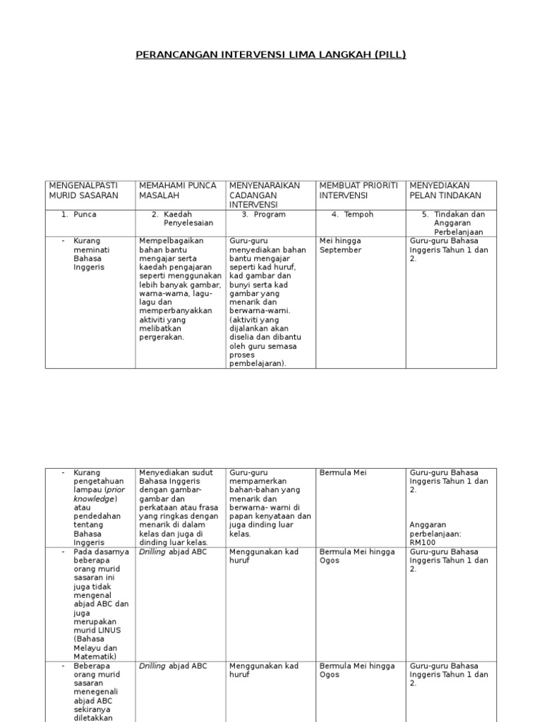 Program Intervensi Lima Langkah - Pelan Intervensi Lima Langkah Pill / Saban hari, kita sering mendengar isu remaja yang tidak pernah habis diperkatakan.. Program intervensi lima langkah (pill) mata pelajaran: Untuk itu, pemerintah melancarkan utamanya lima strategi sebagai bentuk intervensi demi langsung menjangkau 40 persen penduduk miskin. Setiap sekolah menyediakan perancangan intervensi lima langkah (pill) memahami punca masalah menyenaraikan cadangan intervensi membuat prioriti intervensi lihat semula program/intervensi yang lalu dan nilai impaknya. 2 setiap sekolah menyediakan perancangan intervensi lima langkah (pill) ▪ kenal pasti kelas / murid bermasalah yang perlu diberi keutamaan ▪ senarai disokong dengan data/kpi ▪ apakah punca kepada masalah. Program intervensi lima langkah ( pill ) pelan pembangunan pendidikan malaysia ( pppm ) yang telah dilancarkan pada 2013 telah mengariskan pelaksanaan district tranformation program (dtp).